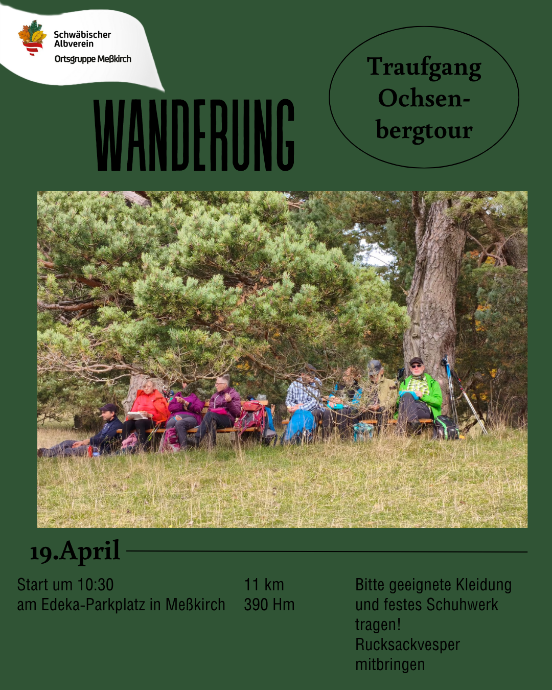 Für die Mittagsrast bitte Rucksackvesper mitbringen, wer gerne mit Stöcken wandert, soll das tun.